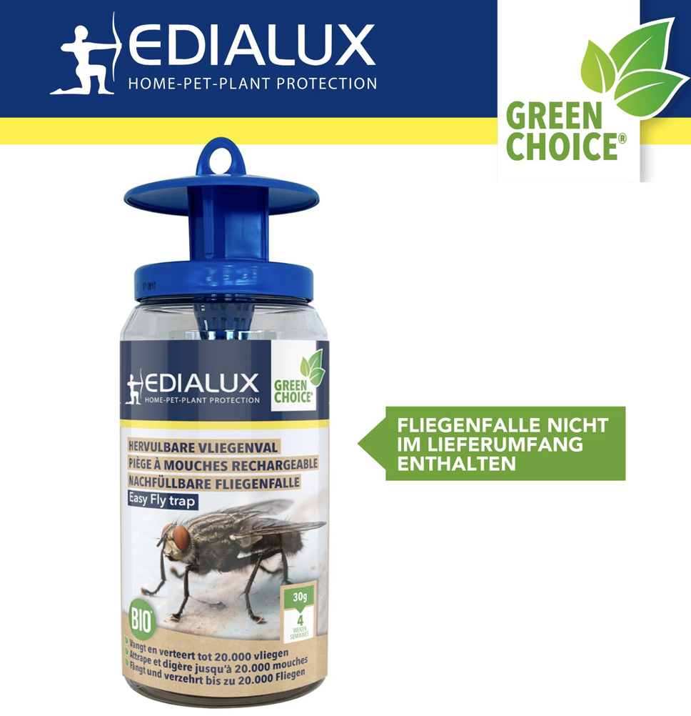 Mejore el rendimiento de su trampa para moscas Edialux con este eficaz repuesto. Diseñado para exteriores, este atrayente natural para moscas es perfecto para mantener su jardín, patio y establo libres de moscas. El cebo soluble en agua se activa de 2 a 5 horas después de añadir agua, atrayendo todo tipo de moscas, excepto las que pican. La levadura digestiva especial descompone todas las moscas capturadas, asegurando que la trampa mantenga su eficacia hasta por 4 semanas. Este repuesto ecológico es seguro para el medio ambiente, los niños y las mascotas, y ofrece una solución sostenible para el control de moscas. Cada paquete contiene cinco sobres de 30 g que ofrecen hasta 20 semanas de protección