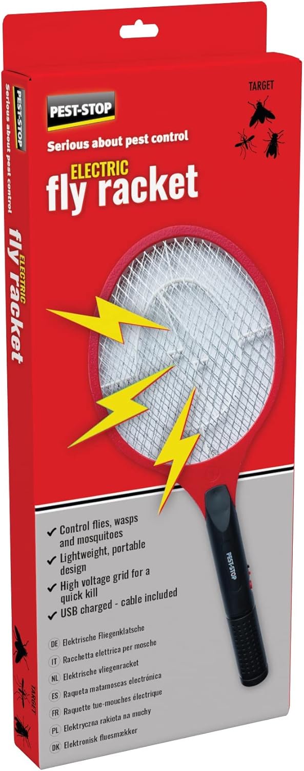 La raqueta matamoscas electrónica de Pest-Stop cuenta con una rejilla de 3500 V para matar rápidamente a los insectos voladores dentro de una vivienda, incluidas las moscas, los mosquitos y las avispas. La raqueta cuenta con un botón deslizante de apagado/encendido para mejorar la seguridad, además de un botón que hay que mantener pulsado para que la rejilla se ponga en funcionamiento.